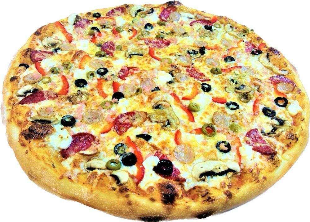 Фирменный томатный соус, сыр моцарелла, творожный сыр «Креметте», перец болгарский, шампиньоны , смесь оливок и маслин , салями с/к , колбаски баварские, ветчина.