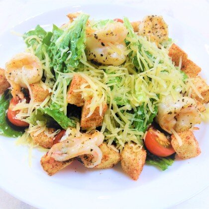 салат «Айсберг», фирменный соус «цезарь», гренки, сыр, свежее филе семги, маринованное в соевом соусе, томаты черри