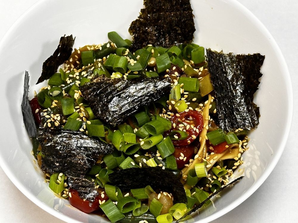 Лапша , куриное филе, томаты черри, кунжут, лук красный , перец болгарский, нори, лук зелёный, чеснок сушеный, имбирь сушеный, СОУС ТЕРИЯКИ.