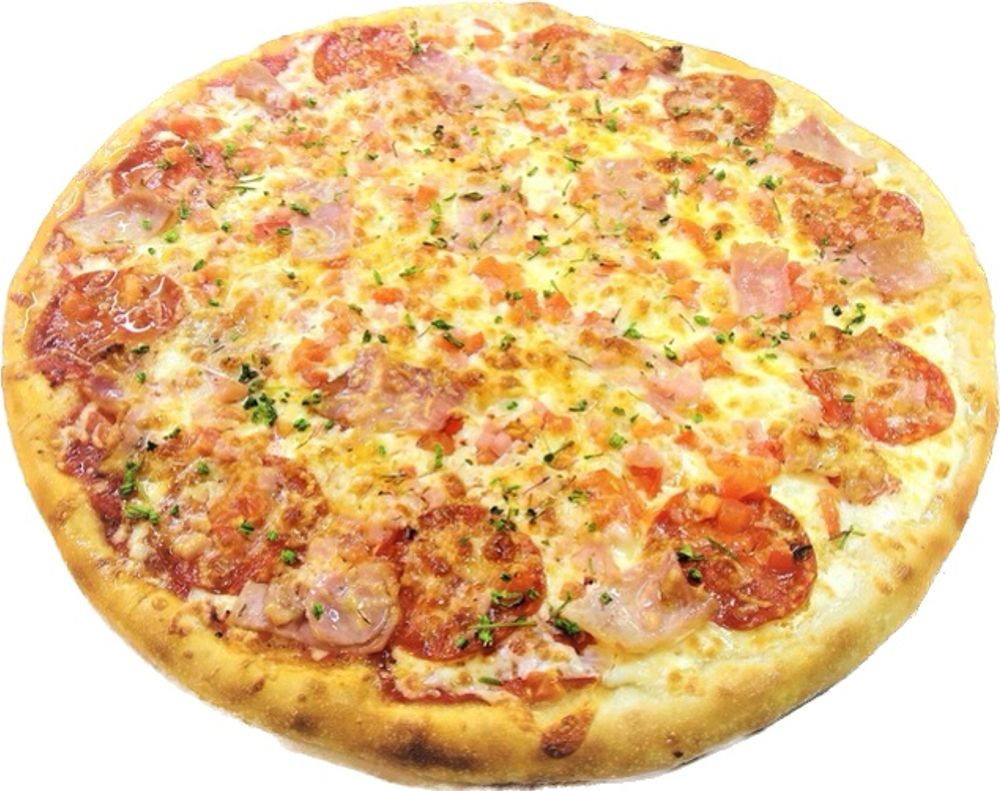 Фирменный томатный соус , фирменный сливочный соус, сыр моцарелла, сыр чеддер , помидоры, ветчина, пепперони , бекон.