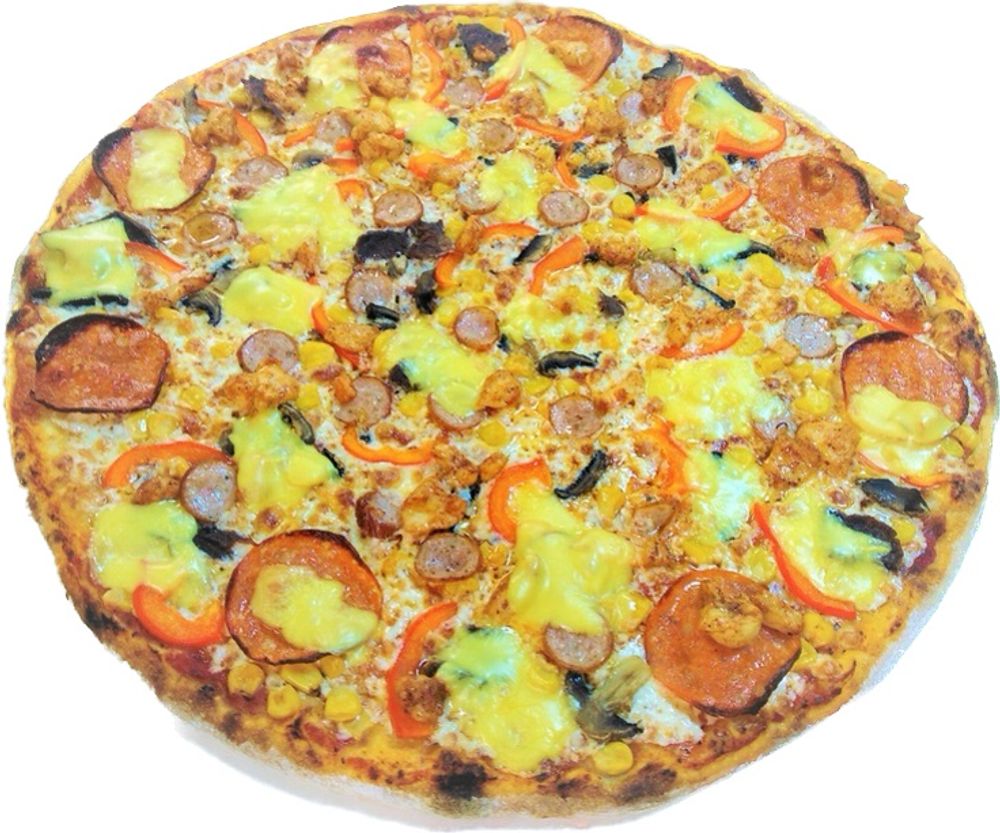 Фирменный томатный соус , сыр моцарелла , пепперони , пастрами из говядины, колбаски баварские, перец болгарский , шампиньоны , сладкая кукуруза , сыр чеддер , куриное филе