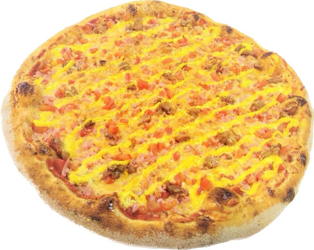 Фирменный томатный соус , сыр моцарелла, нежная ветчина , куриное филе маринованное, свежий помидор, сырный соус.