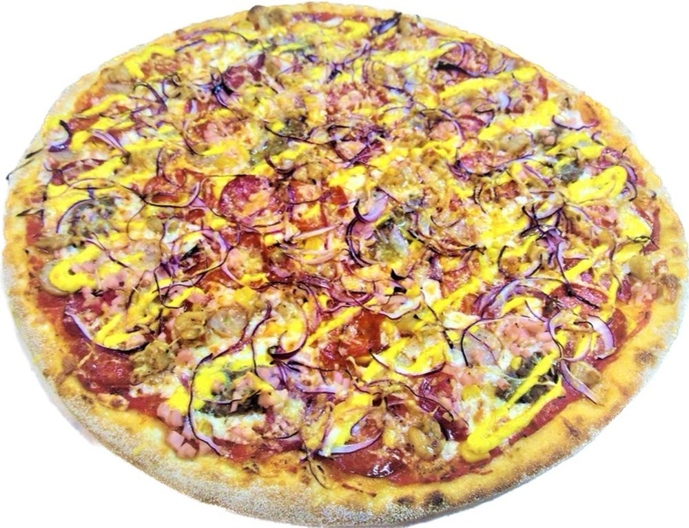 Фирменный томатный соус , сыр моцарелла , нежная ветчина , куриное филе маринованное, кукуруза, лук , сырный соус, пастрами из говядины, пепперони, салями, колбаски баварские, бекон.