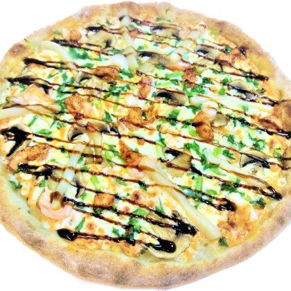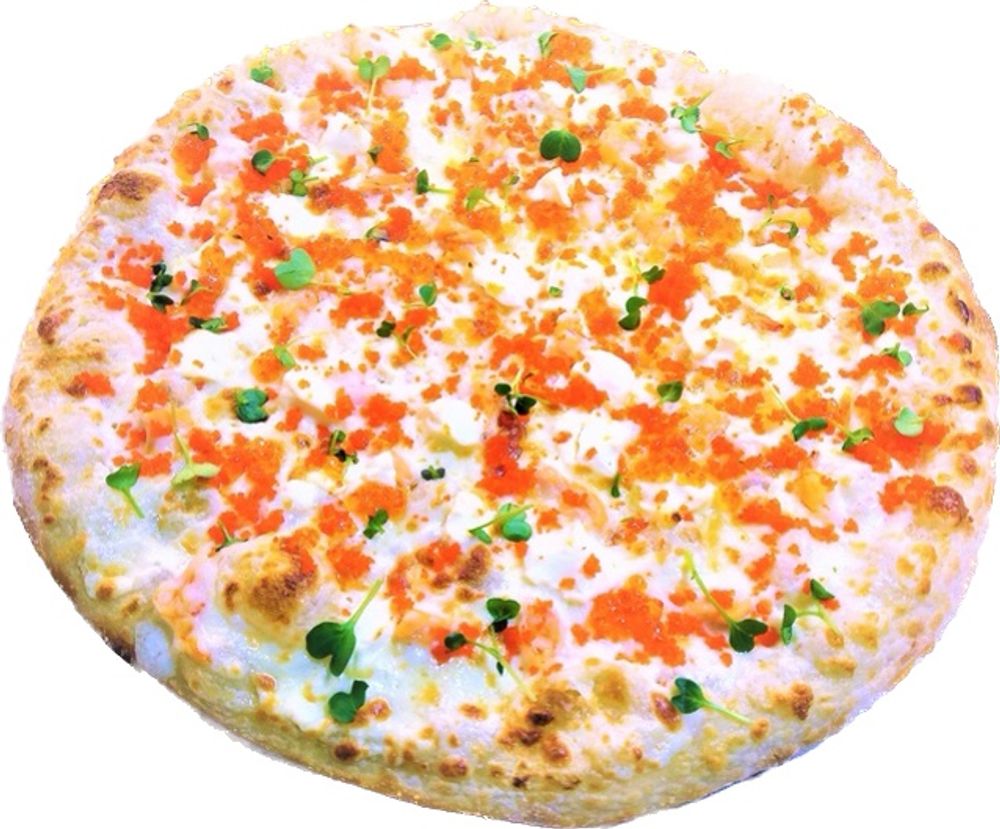 Фирменный сливочный соус , творожный сыр «Креметте», семга , креветки тигровые, сыр моцарелла, красная икра, икра масаго (зеленая , оранжевая или черная)