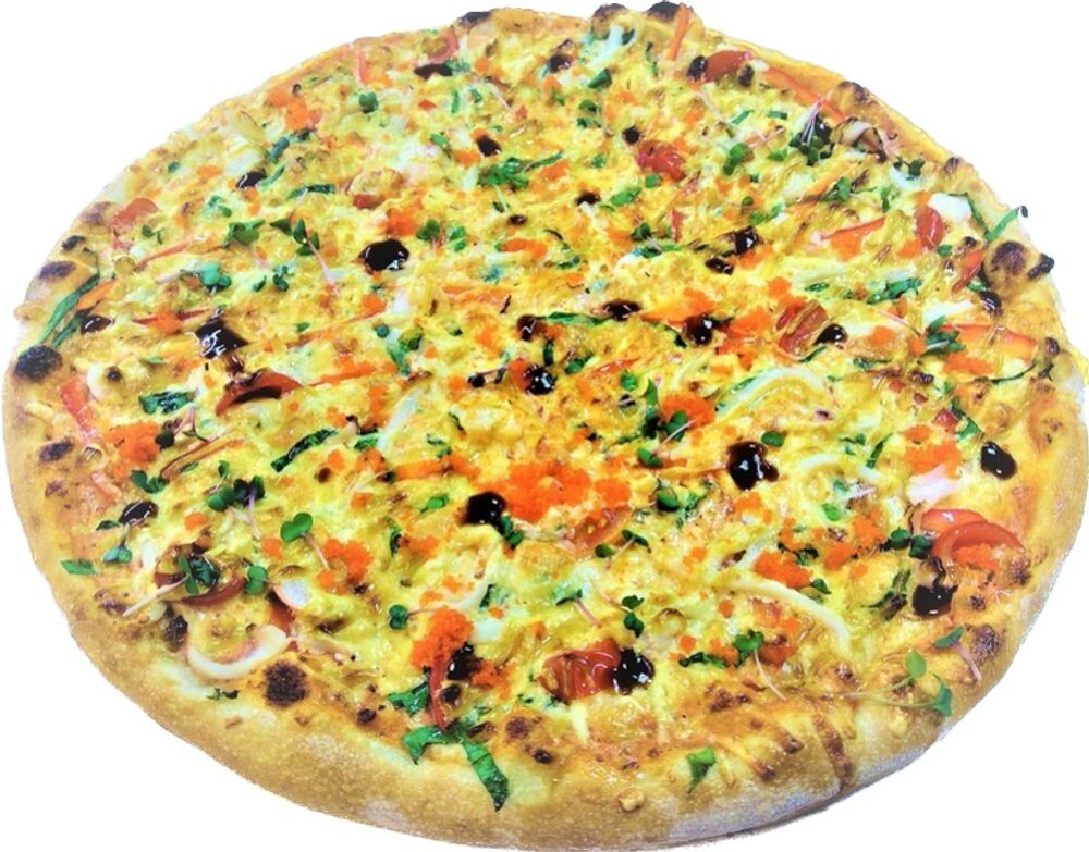 Фирменный сливочный соус , фирменный томатный соус, сыр моцарелла, томаты черри, шпинат, перец болгарский, креветки , филе кальмара, икра масаго (зеленая , оранжевая или черная), соус «Белый» , соус устричный, творожный сыр.