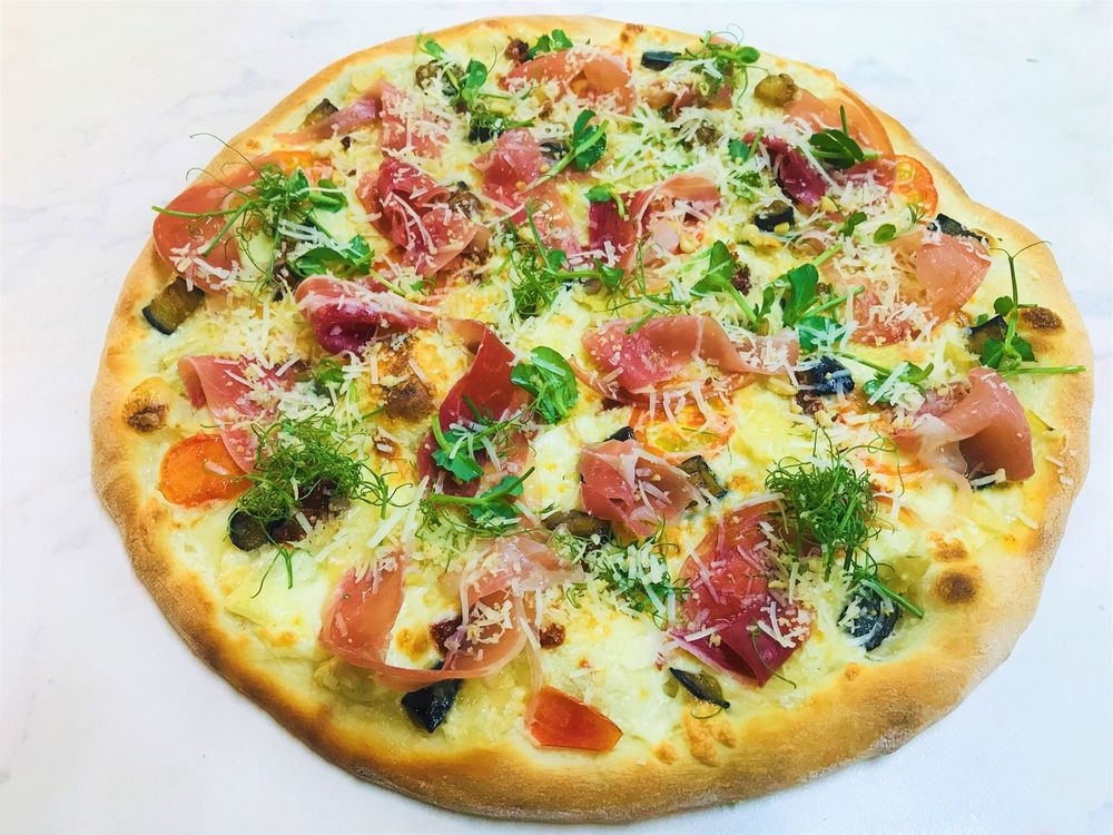 Фирменный сливочный соус , сыр моцарелла, томаты черри, сыр с голубой плесенью, жареный баклажан , сыр пармезан, кедровый орех , маринованные артишоки, прошутто «Пармская Ветчина».