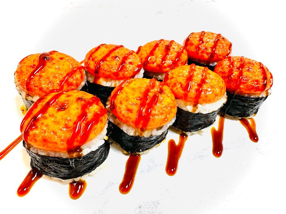 Рис, нори , сыр чеддер, сыр творожный , филе лосося , соус спайси, соус унаги. .