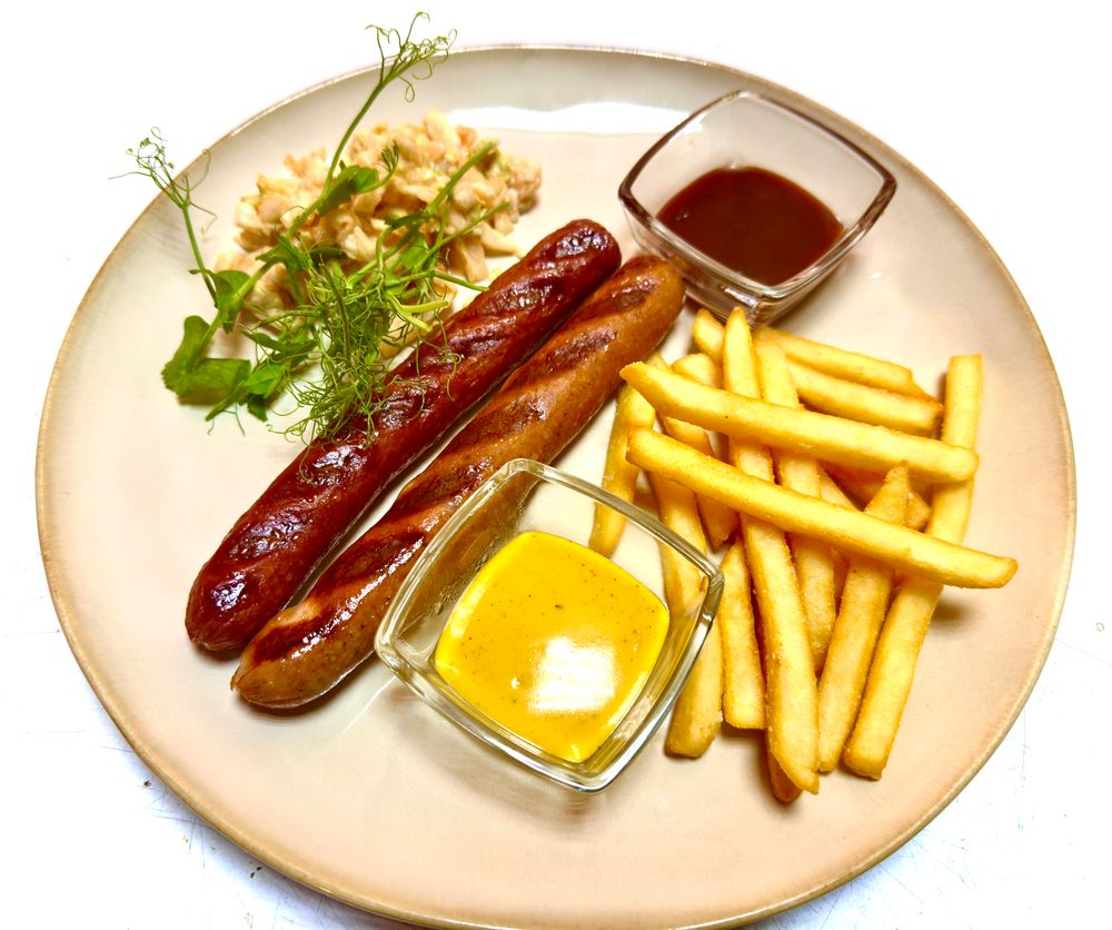 Колбаска из свинины, колбаска из говядины, капуста пекинская кимчи , картофель фри , соус барбекю, соус горчичный.