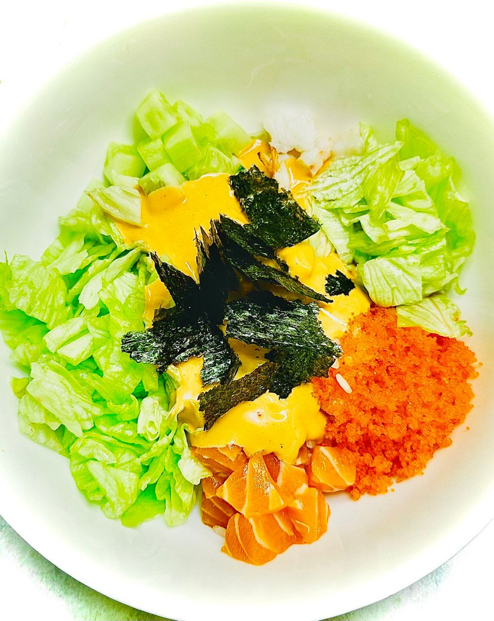 Рис, соус "Спайси" , соевый соус, лосось , креветка, салат , сердцевина огурца, икра масаго, лист нори.