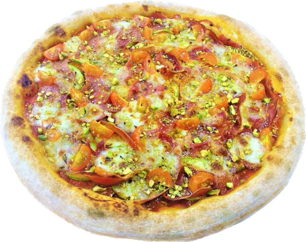 Фирменный томатный соус, сыр моцарелла « Фиор ди Латте » из натурального коровьего молока, цукини, прошутто «Пармская ветчина» , томаты черри, фисташки