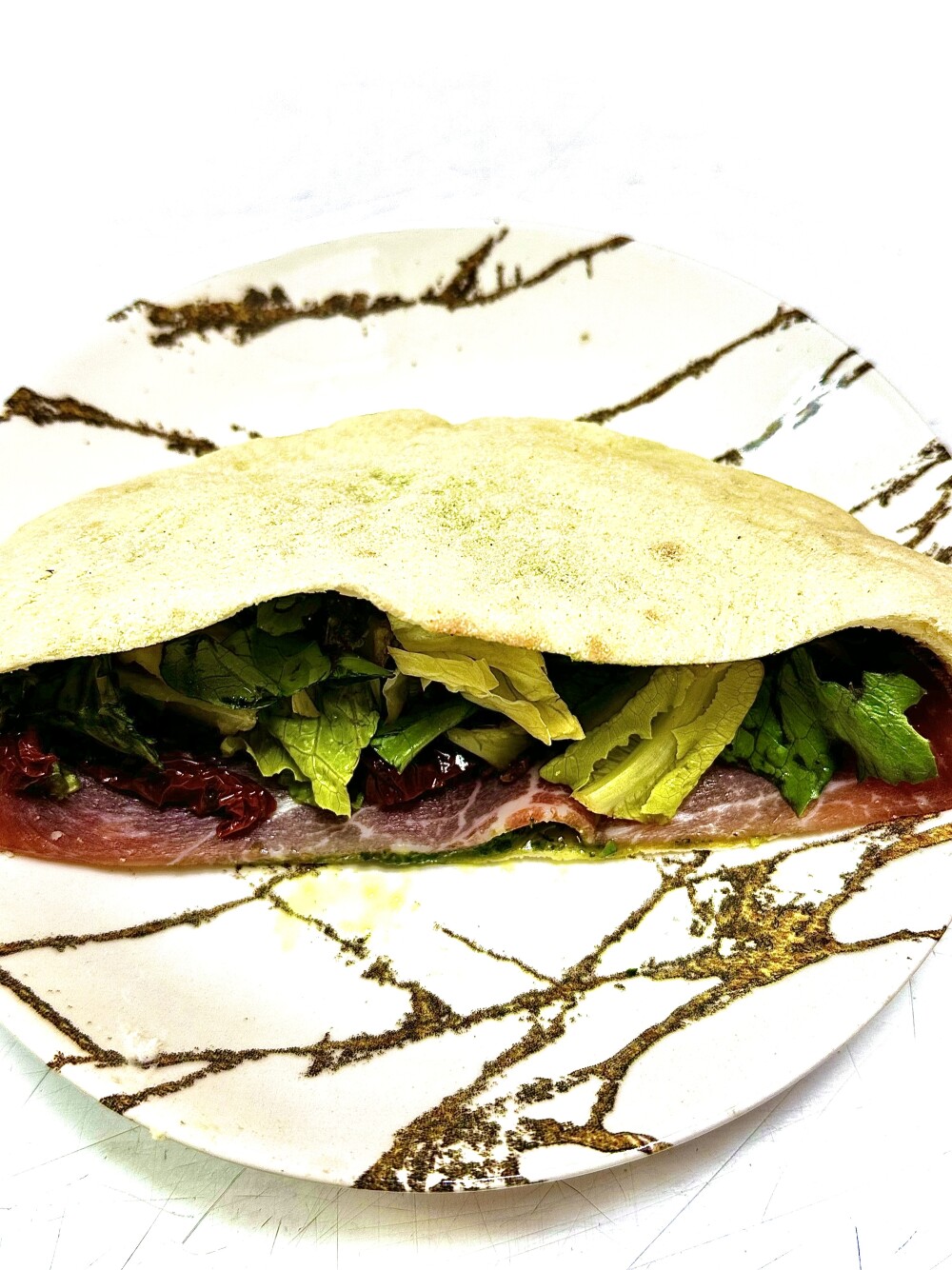 Лепешка из ферментированного теста, пармская ветчина прошутто, соус песто, салат, вяленые томаты.