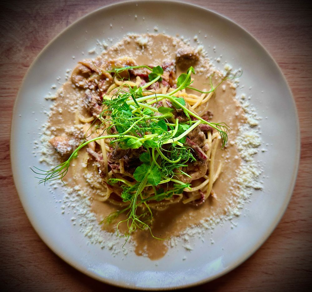 Сытная паста с крепким грибным и говяжьим вкусом . Состав: паста "De Cecco" , томлёная говядина , грибы вешенки , грибы шампиньоны , пыль из сушеных белых грибов , говяжий соус, сливки, лук карамелизированный .
