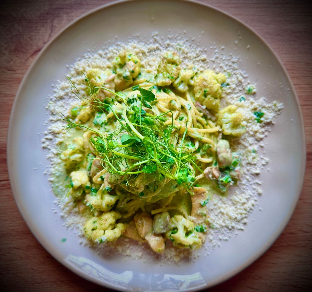 Летняя паста с нежным соусом и ароматной зеленью . Состав: паста "De Cecco", куриное филе , цветная капуста, масло сливочное , грибы шампиньоны , шпинат , лук зелёный , сливки .