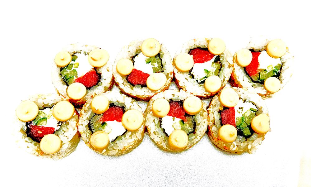 Рис, нори, мягкий творожный сыр , хрустящий огурец, охлаждённый лосось, обжаренный золотистый кунжут, соус "Белый" ( фактический вид ролла и вид на фото могут различаться )