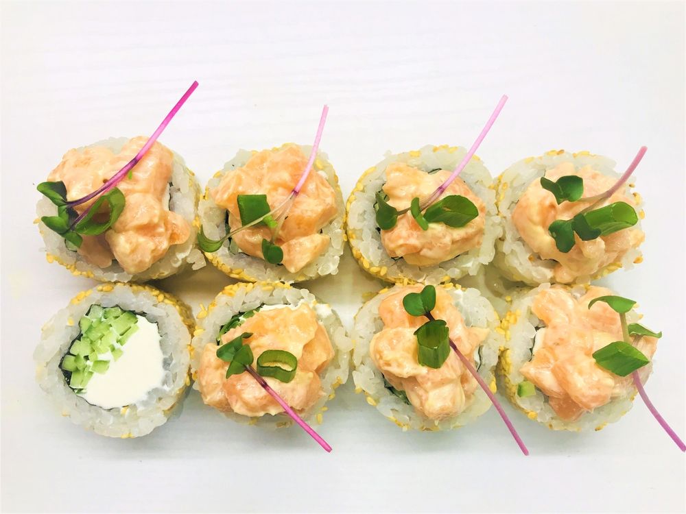 рис, нори, мягкий творожный сыр , хрустящий огурец , охлаждённый лосось, лук зеленый, соус Белый, обжаренный золотистый кунжут (фактический вид ролла и вид на фото могут различаться)