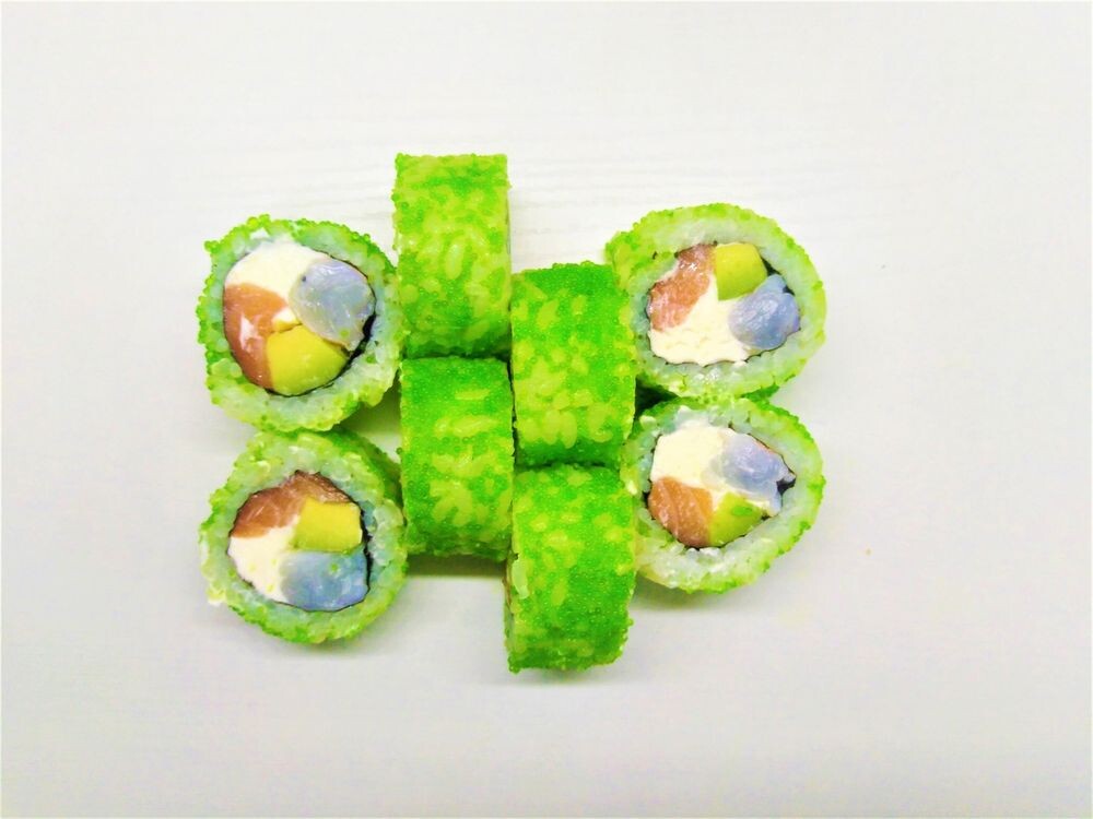 Рис, нори , охлаждённый лосось, мягкий творожный сыр , хрустящий огурец, тигровые креветки , икра масаго (зеленая , оранжевая или черная)( фактический вид ролла и вид на фото могут различаться )