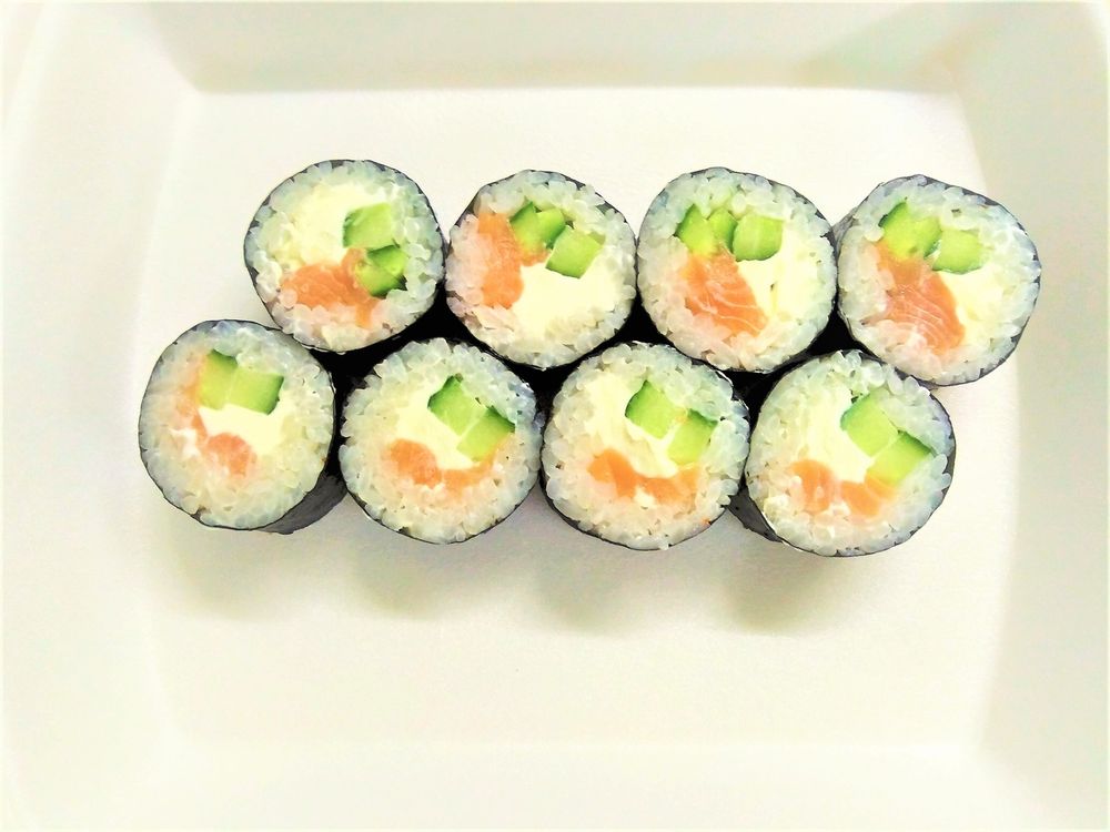 рис, нори, мягкий творожный сыр, хрустящий огурец , охлажденный лосось