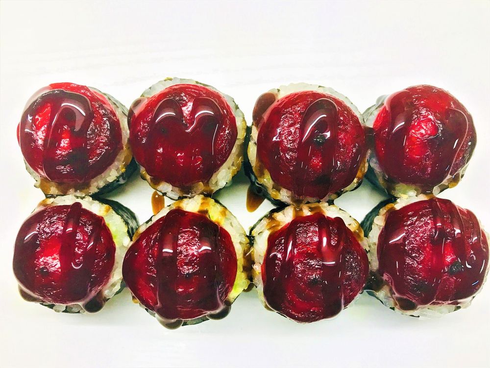 Рис, нори, мягкий творожный сыр, маринованная редька «такуан» , нежное сурими, соус "Лава" , соус "Унаги" ( фактический вид ролла и вид на фото могут различаться )