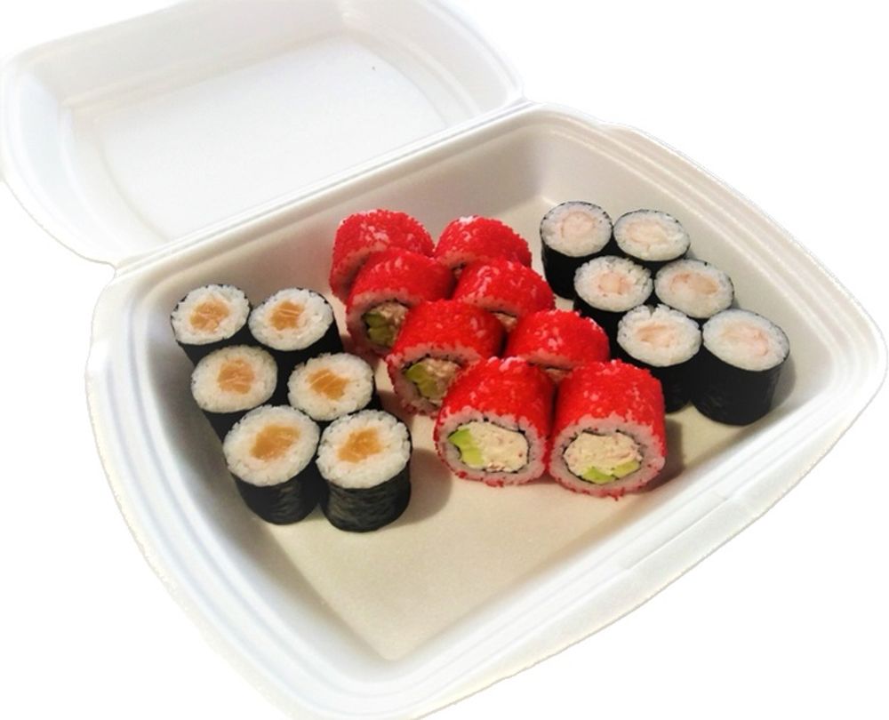 Маки ролл с лососем— 1 шт Маки ролл с креветкой— 1 шт Калифорния — 1 шт. ( фактический вид роллов и вид на фото могут различаться )