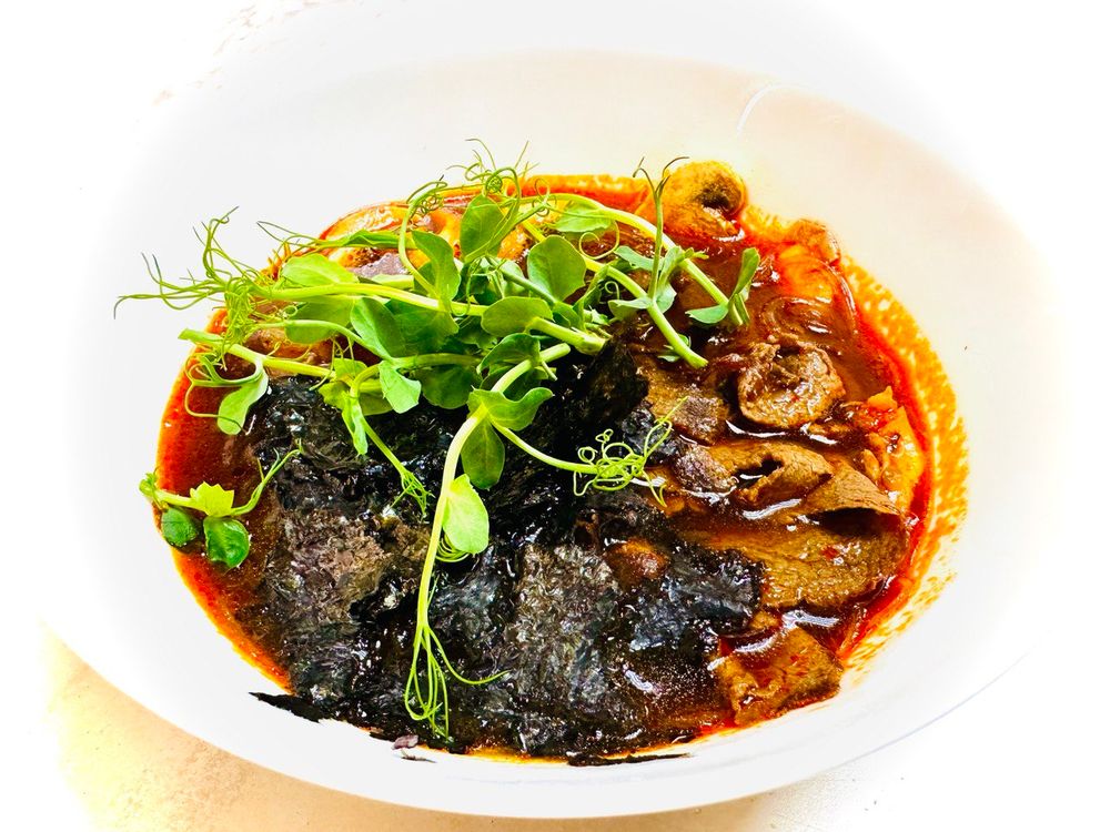 Паста Том Ям, говяжья вырезка, грибы, лапша фунчоза , нори, зелень .